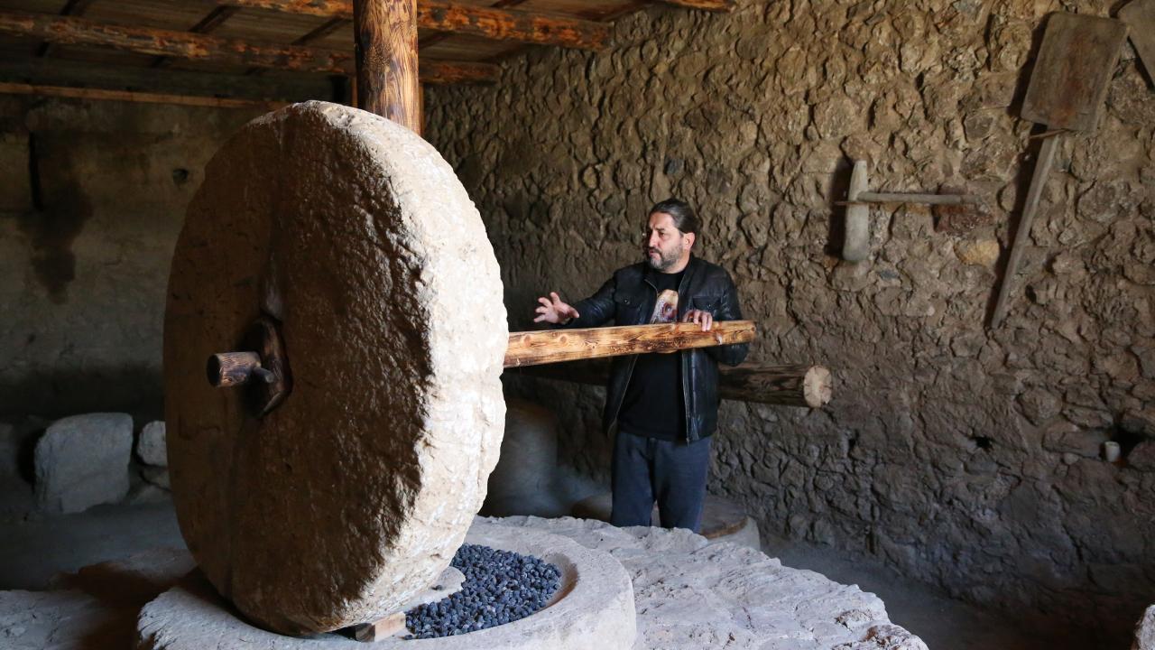 "Bakanlığımıza bu bulguların belgelerini ve verilerini paylaştıktan sonra, burayı yeniden ayağa kaldırarak, gelen ziyaretçilere zeytinyağı üretimini göstermek amacıyla çalışma yaptık. Burada zeytinler işliklerde kırılıyor, pres bölümüne götürülüyor, ahşap kollar ve mekanizmalar yardımıyla zeytinyağı sıkılarak kaplara biriktiriliyor. Daha sonra çeşitli aletlerle diğer depolama kaplarına aktarılıyor."